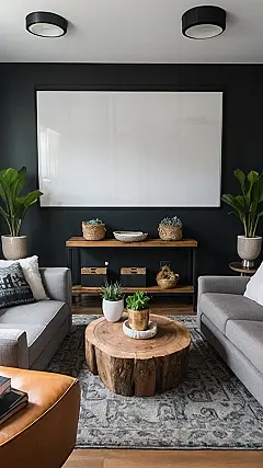 This living room is proof that you don’t need a king’s ransom to feel like royalty! Look at that amazing, rustic coffee table‚Äîit’s like a giant tree stump got a makeover, and it totally steals the show. The dark walls add a touch of sophisticated mystery, while the comfy sofas and cozy rug make it feel super inviting. It’s all about clever choices, like using simple baskets for storage instead of expensive decorative boxes. This room shows you can definitely get a fancy vibe without emptying your piggy bank!