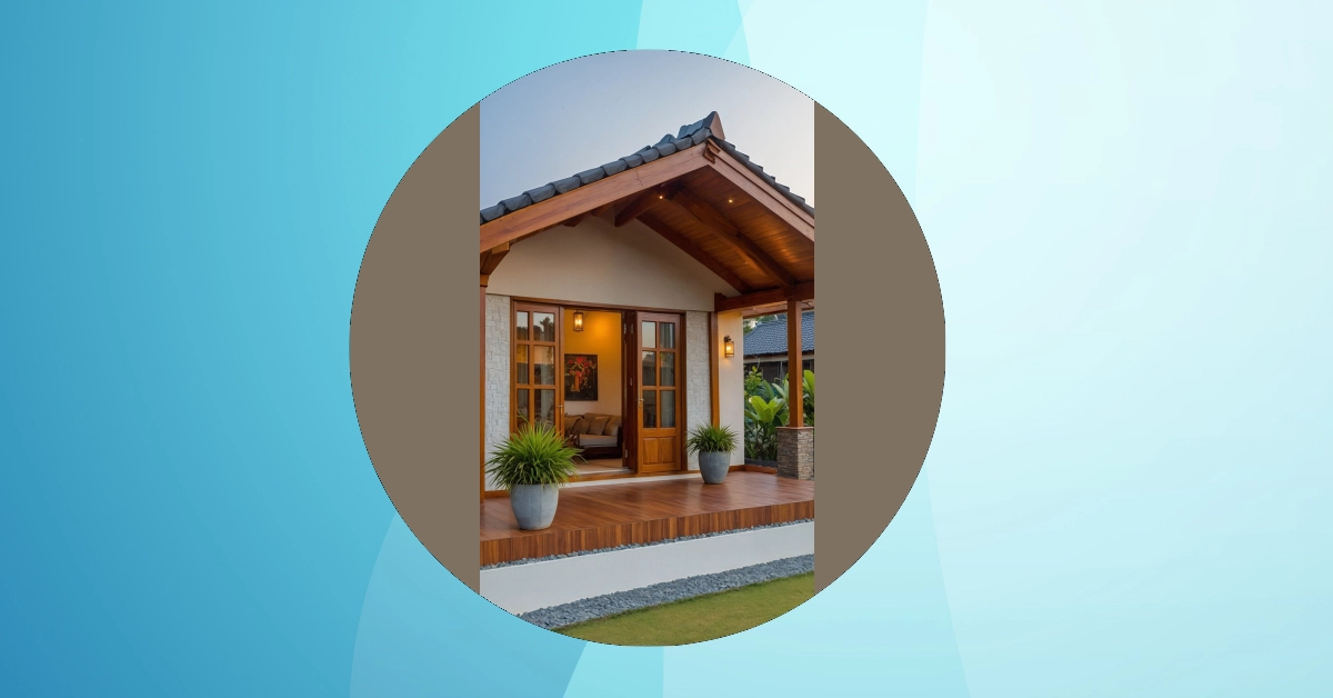 Forget those towering multi-story houses where you need a GPS just to find the kitchen! This bungalow is all about keeping things super chill and easy. With its crisp white walls and warm wooden doors and windows, it practically screams, “Come on in, kick off your shoes, and let’s have a snack without climbing a single stair!” It’s like the house itself is saying, “Why go up when you can just spread out and relax right here?” Plus, that cool terracotta roof looks ready for a tiny, friendly dragon to perch on it, just for fun.