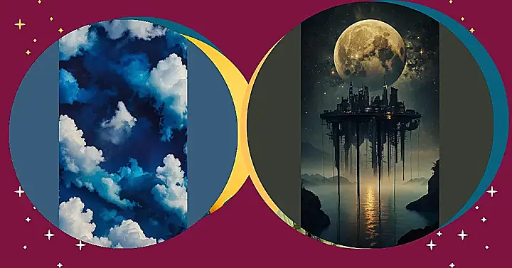 Whoa, talk about living life on the edge – literally! This artistic wallpaper shows a whole futuristic city chilling out on what looks like a gigantic, fancy dinner plate, floating just beneath the most colossal moon you’ve ever seen. We bet the rent up there is out of this world (pun totally intended!), and you’d never have to worry about noisy downstairs neighbors, only maybe space junk. It makes you wonder if they have space-proof umbrellas for moon dust or if they just wave at passing UFOs. Finding your way home after dark would be a breeze though: “Just look for the city with the super long, spindly legs hanging over the misty water!”