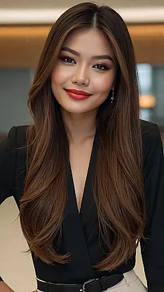 The picture shows a girl with hair so smooth and shiny, it looks like silk! Seriously, her hair is like a waterfall of luxurious brown silk. You could probably bounce a quarter off those strands! It’s the kind of hair you just want to run your fingers through, even if it might be a bit weird to do that in public.
