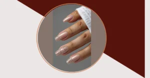Look at these nails – they’re basically ready for their own photoshoot! On some fingers, you’ve got this super chic nude polish decked out with delicate golden swirls and sparkly little gems. It’s like each nail is its own tiny piece of art, making you feel instantly fancy and like you could conquer the world (or at least ace that pop quiz) just by showing off your hands. Seriously, these nails probably have their own fan club!