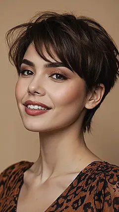 This haircut is basically a superhero cape for your head. Picture this: you hit snooze five times, roll out of bed, give your hair a quick fluff (maybe a spritz if you’re feeling fancy), and boom – you’re instantly looking sharp and ready to go. No more spending an hour trying to untangle knots or figuring out a braid that actually works. The bixie cut, just like the one our friend in the leopard print is sporting, says “I’m confident, I’m cool, and I definitely didn’t spend forever on my hair.” It’s the ultimate ‘I woke up like this, but better’ vibe for your busiest school days or weekend adventures.