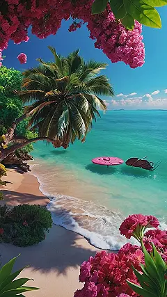 This wallpaper is like hitting the jackpot of summer vibes! Just looking at that crystal-clear water makes you want to grab your swimsuit and dive right in, even if you’re stuck inside doing homework. Plus, who wouldn’t want to chill under those bright pink flowers and daydream about building sandcastles instead of writing that essay? This image is basically a permission slip from your phone to start planning your next beach getaway.