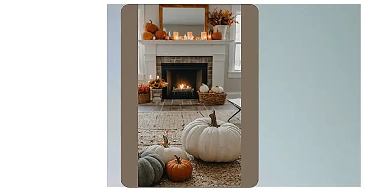 Even though we can’t smell that fireplace or feel the warmth of the rug, this picture gives us some great fall decor ideas. Just look at those pumpkins – they’re not your typical orange ones! The white pumpkin is like a cool, calm autumn breeze, and the gray one is like a stormy fall sky. Doesn’t that make you want to get creative with your own pumpkins this year? Maybe you could paint some pumpkins to look like your favorite fall things – maybe even your favorite spooky character from a scary movie! Get creative!