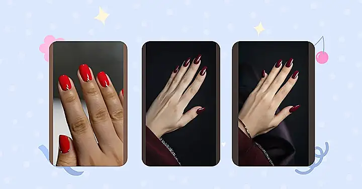 The image shows a hand with perfectly manicured nails painted a deep, rich red. It’s like a tiny piece of art on each finger! The red is so vibrant and glossy, it makes you want to reach out and touch it. The color looks elegant and sophisticated, and it would be the perfect way to add a touch of glamour to any outfit.