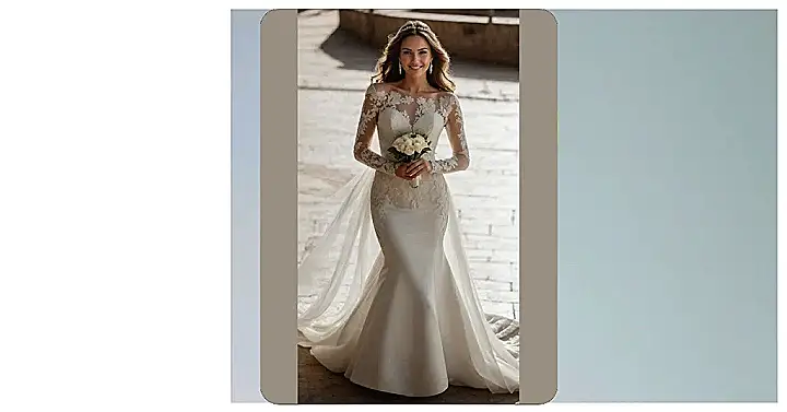 That stunning ivory color in this dress is basically yelling “Look at me, I’m the main character!” while probably whispering a silent prayer that nobody spills grape juice within a 50-foot radius. It’s got all that fancy lace on the sleeves, making you look like royalty, or at least someone who really understands the importance of dramatic hand gestures. Honestly, you’d need a personal assistant just to manage the veil and make sure you don’t trip walking down the aisle.