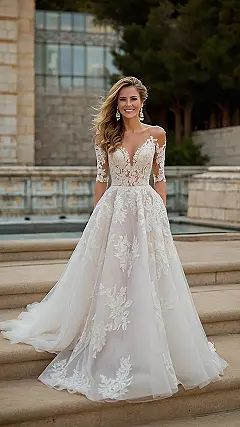 This gorgeous white wedding dress is like something out of a fairytale! Imagine yourself walking down the aisle, feeling like a princess in this beautiful gown. It’s all lacy and flowy, perfect for a dreamy wedding in a garden or a fancy palace (like the one in the picture!). The dress is so pretty it makes even the steps it’s on look fancy. You’d definitely be the star of the show!