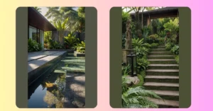 Check out these plants! They look like they’ve just stepped out of a fancy salon, especially the ones with those super smooth, light-colored trunks. It’s like they decided, “Why grow a thick, boring trunk when you can rock a chic, slender look?” Tucked into these cool deck planters, they’re basically the fashion models of the plant world, strutting their stuff next to a shimmering water runway. They’ve even got their own black pebble carpet, which is way fancier than regular dirt. These aren’t your grandma’s flower pots; these are where plants come to feel fabulous and add serious style to any outdoor hang-out spot.