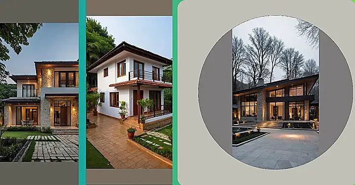 Check out this house! It totally nails the ‘village house design’ vibe but also looks like it’s ready for its close-up. Instead of a tiny cottage, this place is giving us serious main character energy with its cool, layered roof that looks a bit like a stylish hat collection. Those big wooden doors and stone bits give it that classic feel, while the huge windows probably let in enough light to power a small city, or at least help you find that lost sock under your bed. It’s the kind of house you’d expect to find in a chill village, ready for cozy evenings.