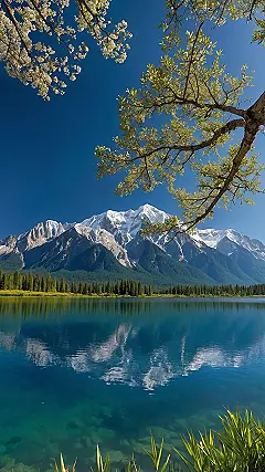 Notice how the huge mountains are literally chilling out in the reflection on the water, like they’re practicing their selfie poses. And check out those tree branches up top, framing the whole scene like a fancy picture frame! The water isn’t just blue; it’s got these cool turquoise bits where you can actually see the rocks underneath. Who knew water could be so clear it practically says “no filters needed”? If your phone screen is currently showing your messy desk or an embarrassing old photo, it’s time to upgrade to this absolute stunner. It’s the ultimate ‘Nature serenity wallpaper’ that’ll make you feel calm, even when your alarm clock has other plans.