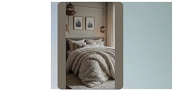This bedroom looks like the perfect place to curl up with a good book on a snowy day. The fluffy blanket and soft pillows invite you to relax, while the picture of the snow-covered forest makes you feel like you’re right in the middle of a winter wonderland. The warm lights add to the cozy atmosphere, and the little touches of winter decor, like the pine cones and the fuzzy throw, make it feel extra special. You can almost hear the gentle sound of snow falling outside as you snuggle in for the night!