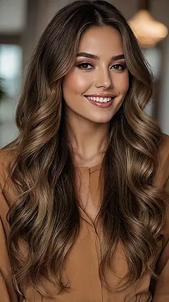 Forget about hair that gets flattened by your beanie or zapped with static every time you take off your scarf. This style, with its warm highlights and flowy waves, is basically a hug for your head! It pairs perfectly with all your cozy sweaters, like the super comfy one in the picture, making you look effortlessly cool and warm. Plus, it looks like it can easily go from a snowball fight to a study session without missing a beat, keeping you looking amazing all season long without needing a team of stylists.