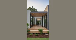 Walking up to this bungalow, you might just hear a chorus of invisible gnomes whispering, “Welcome home, awesome human!” With that super sleek wooden deck and those giant, inviting doors, it practically screams, “Kick off your shoes and forget about that algebra homework for a bit!” The cool grey pots holding those spiky green plants look like they’re guarding the entrance, making sure no bad vibes (or forgotten chores) get past the threshold. It’s the kind of place where you half expect a butler to appear with a plate of cookies, even if it’s just your own stomach rumbling.