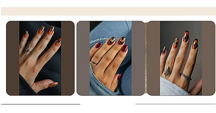 These nails are like a walk in the park during peak fall foliage! The beautiful, warm tones of brown and gold give off serious autumn vibes. It’s almost like the leaves themselves decided to jump onto these nails and say, “Hey, we’re here to stay!” You can’t tell if the nails are covered with leaves or if they’re actual rings!