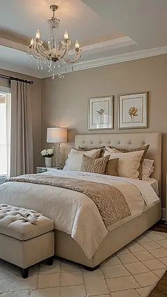 Looking at all that beige, it’s hard to believe it’s not a giant, cozy marshmallow. I bet that bed is the comfiest thing ever, perfect for Netflix binges and daydreaming about winning the lottery. And that chandelier? Fancy! It’s like the room is saying, “I’m sophisticated, but also totally down for a nap.” Now, who wouldn’t want a room like that?