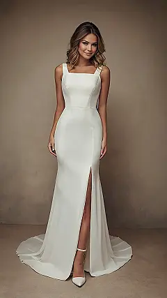 You know how some wedding dresses look like they ate a whole bakery worth of layered cakes? Well, this one decided to go on a super stylish, modern diet! With its sleek lines and smooth fit, it’s basically saying, “I’m here to get married, not to re-enact a historical drama.” It’s simple, chic, and probably won’t require a forklift to get you down the aisle, which means more energy for celebrating and showing off your awesome dance moves later. Less fabric drama, more fabulousness!