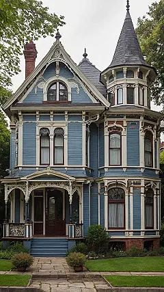 Wow, check out this Victorian beauty! It’s like a giant, super fancy dollhouse come to life, painted in this awesome deep blue with creamy trim that just pops. See all those intricate details, like the lacy bits on the porch and those adorable little windows tucked into the roof? This house definitely didn’t believe in “less is more.” It’s got more personality than a whole block of modern homes combined, probably even has a resident ghost named Bartholomew who just wants to borrow your Wi-Fi.