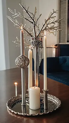 Wow, check out this fancy Christmas candle holder setup! It’s like a tiny, sparkly, silver city for candles. There’s this awesome tree-shaped thing in the background, making it look like the candles are celebrating Christmas in a winter wonderland. It’s all super shiny and elegant – probably makes the perfect centerpiece for a Christmas dinner, or maybe even a really fancy birthday party! I bet it smells amazing too, especially when all those candles are lit.
