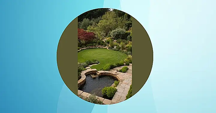 But wait, there’s more! Just below that epic lawn is a stone-lined pond, looking all mysterious and inviting. It’s not just a puddle; it’s practically a secret lagoon, perfect for skipping a smooth stone or maybe even having a deep philosophical chat with a very confused frog. With all those cool stone pathways and lush green plants tucked into every corner, this garden isn’t just a pretty picture; it’s a whole adventure waiting to happen. You could totally pretend you’re an explorer discovering new plant species, or just find the perfect cozy nook to hide from your responsibilities for a bit. Talk about a glow-up for the backyard!