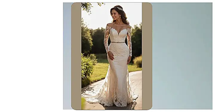 Stepping out in this dress, our bride definitely looks ready for her fairytale moment, and maybe even a red carpet premiere! This stunning gown, with its delicate lace sleeves and sparkling belt, isn’t just pretty; it’s practically a superhero suit. It hugs in all the right places, giving her that amazing hourglass shape that makes you wonder if there’s a secret invisible team of waist-cinching experts working behind the scenes. This is definitely a dress built for grand entrances, and possibly some epic slow-motion turns.
