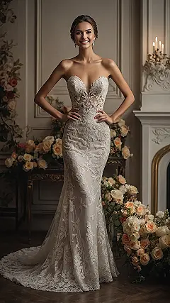 And let’s not forget that amazing, intricate lace that covers every inch, especially on those long, elegant sleeves and the seriously impressive train. It probably took a whole team of skilled designers (and maybe a few tiny fashion elves) to stitch all that beauty together! This kind of wedding dress might make you wonder if you can actually sit down or if you’ll need a personal assistant just to manage the train, but who cares when you look this absolutely stunning? It’s proof that a beautiful, well-fitted gown, maybe with a little hidden corset support, makes a bride shine like a superstar on her big day.