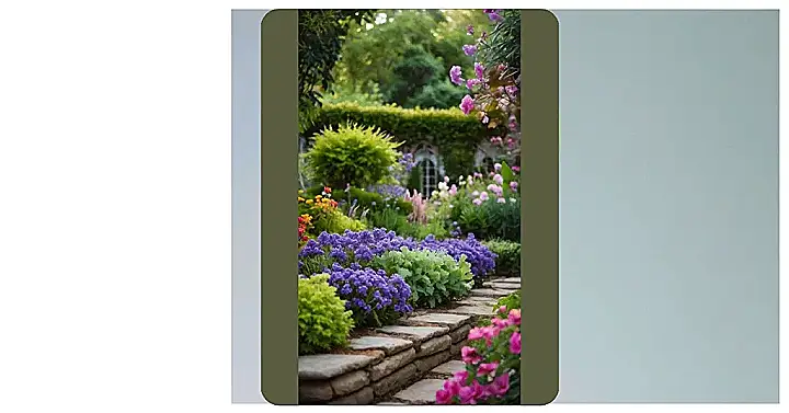 The image shows a charming garden path, winding through a symphony of colors. It’s like a secret passage leading to a magical land! The warm light of the setting sun makes the scene look even more dreamy, bathing the stone path in a golden glow. You can almost imagine yourself taking a step on those smooth stones and being whisked away to a world of wonder and imagination.