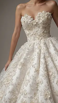 Wow, talk about a serious glow-up for a wedding dress! This isn’t your grandma’s lace; this gorgeous gown is practically bursting with 3D floral amazingness. It looks like a whole secret garden decided to bloom right onto the fabric, with delicate petals popping out everywhere. You can almost feel the texture just by looking at it, making you want to reach out and touch those perfectly crafted little roses and blossoms. It’s definitely a dress designed to make you feel like the absolute queen of the entire botanical kingdom on your big day!