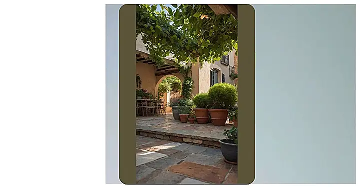 Walking onto this awesome Italian patio feels like stepping into a vacation zone where the biggest decision is deciding which comfy chair to sink into. Look at all those plants chilling in their terracotta pots – they look so relaxed, like they’ve been practicing ‘la dolce vita’ (that’s the sweet life, folks) for ages under that leafy green roof. The cool stone floor probably has a million stories about sunshine and maybe a dropped cannoli or two. It’s got this cool archway leading off to who knows where, possibly a secret gelato stash.