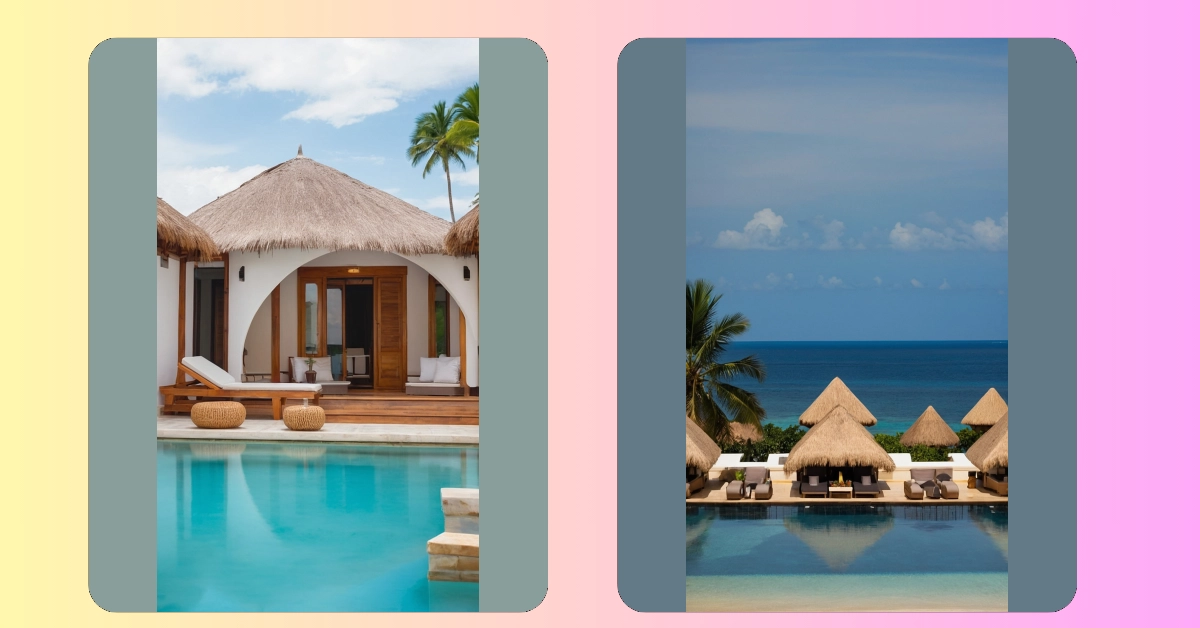 Imagine chilling here! The resort design is like a mix of fancy beach hut and a super cool hideout. I bet those round, woven ottomans are softer than they look, perfect for when you’re waiting for your turn on the lounge chair! Whoever designed this place definitely knew how to make a vacation spot that’s both stylish and totally relaxing.
