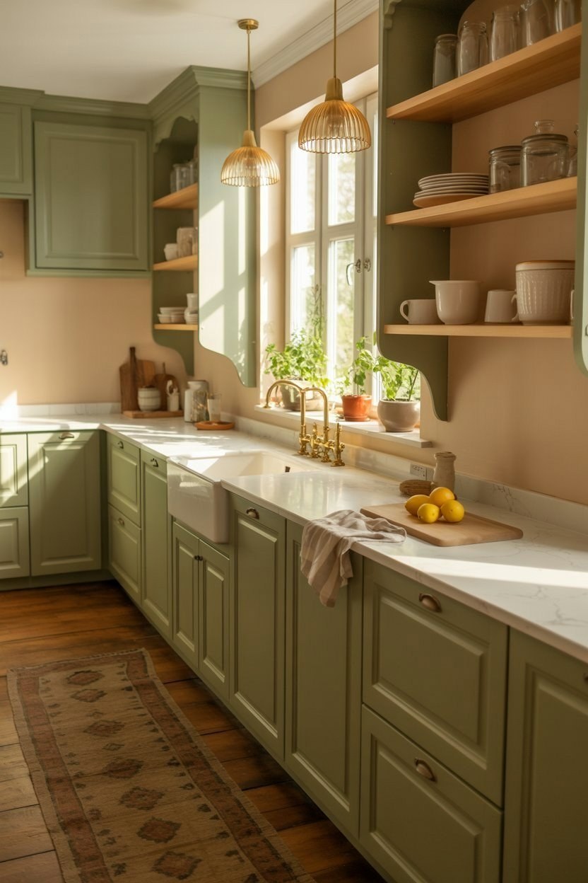 Discover serene sage green kitchen designs featuring open shelving, marble counters, and brass hardware for a charming farmhouse feel. This neutral kitchen with island concept creates a tranquil oasis, embodying japandi style small kitchen principles.