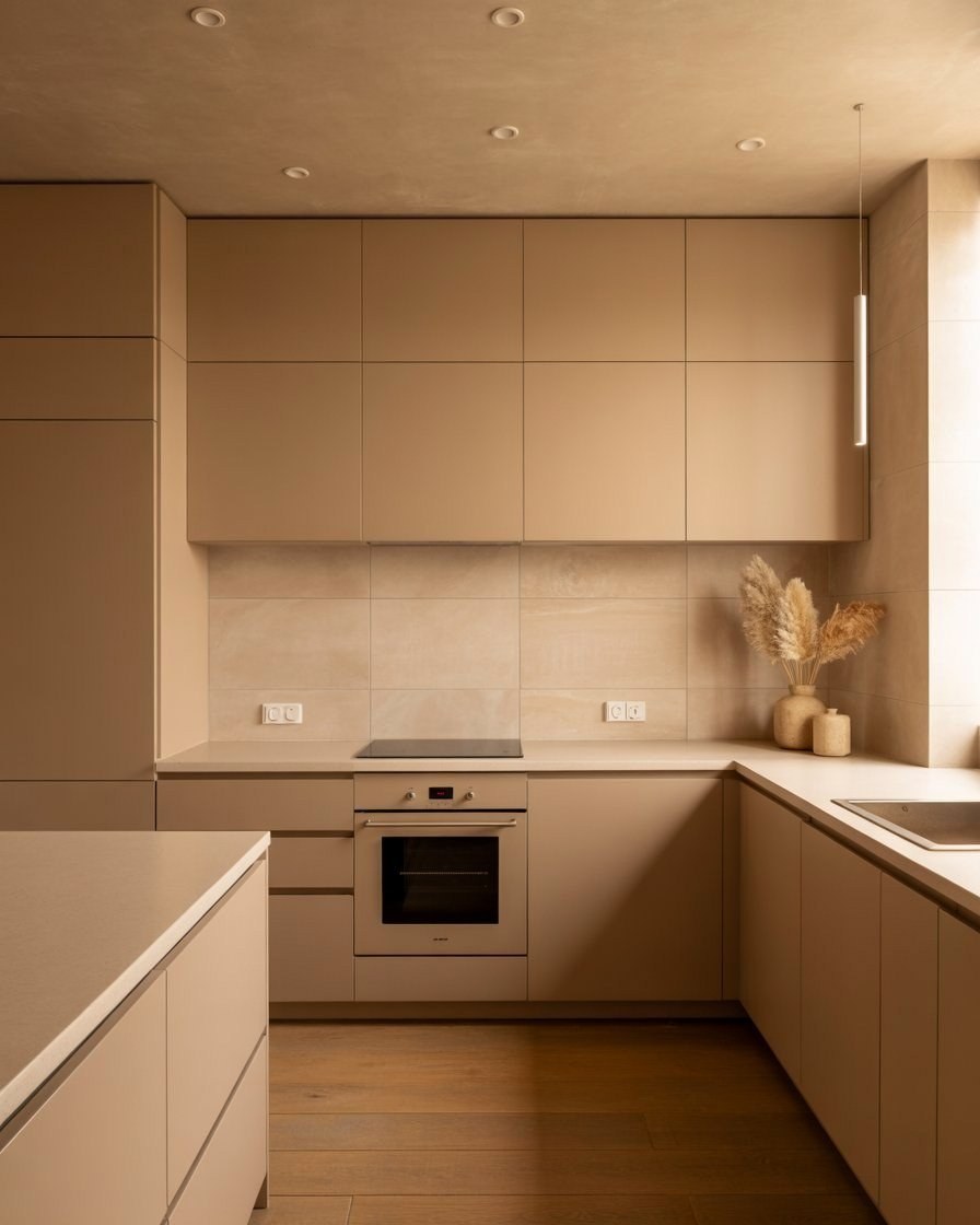 This beige kitchen design proves that compact areas can feel generous and luxurious. Warm lighting and a stone-toned backsplash enhance the modern minimal kitchen design, creating a serene and sophisticated hub.