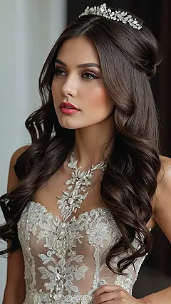 This style proves you don’t need to spend hours in a salon to look amazing. The half-up, half-down ‘do keeps your hair out of your face while showing off those gorgeous curls. And honestly, a pretty accessory like that floral crown makes it look like you tried way harder than you actually did. It’s the perfect hack for rocking a fancy event without the fancy fuss!