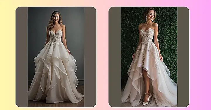 Talk about a dress that’s doing double duty! This stunning number, with its intricate lace and dreamy layers, looks like it could walk right down the aisle and make everyone gasp (in a good way, of course!). It’s got that elegant wedding vibe down pat, showing off just enough flair without making you feel like you’re dragging a carpet behind you. And check out those snazzy shoes peeking out – proof that even when you’re looking like a princess, you can still show off your amazing footwear choice.