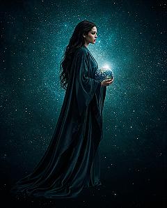 The backdrop of swirling nebulae and distant stars places Gaia within a universal context, reminding us of Earth’s place in the grand cosmic dance.