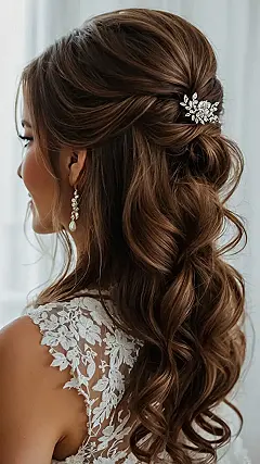 And can we talk about the incredible details? This isn’t just hair; it’s a masterpiece complete with a sparkly little accessory that adds just the right amount of bling. The way some of the hair is elegantly braided and pulled back, while the rest cascades down in those envy-inducing waves, shows serious hair magic. It’s like they bottled up all the good hair days, added a sprinkle of fairy dust, and pinned it all up for one glorious event. Who knew hair could look so effortlessly perfect, even after hours of dancing and celebrating?