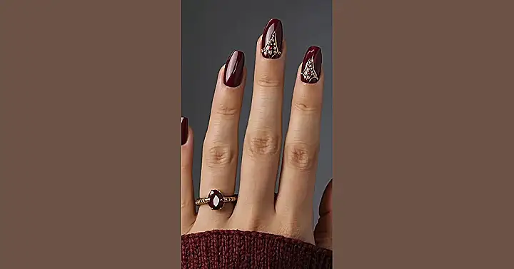 But hold on, because there’s a superstar among these gorgeous nails! That one finger rocking the golden leaf pattern isn’t just a nail, it’s a tiny piece of art making a huge statement. It’s like the nails are saying, “We’re classy, but we also know how to throw a little sparkle in there!” Teamed up with that totally cool criss-cross ring and the cozy sweater, this look is pure perfection. If you’re on the hunt for some epic maroon nails inspo that’ll make everyone double-tap, you just found it. Get ready to show off those fabulous fingertips!