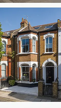 This friendly looking place sports not one, but two cheerful front doors, almost like it can’t decide if it wants to welcome you with a cup of tea or whisk you away on a secret adventure. Maybe one is for polite guests and the other is a portal to Narnia, or perhaps it’s just for when you really need to make a quick exit after forgetting your keys inside. And look at all that greenery! The climbing vines and happy bushes are practically hugging the walls, making the place feel super cozy and lived-in. It feels like the kind of London house where someone bakes amazing cookies and has a dog named Waffles, even if Waffles occasionally tries to eat the lavender.
