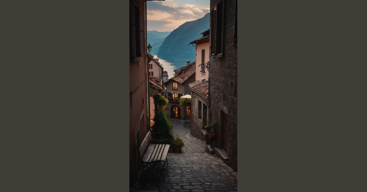 This picture is like a scene straight out of a fairytale! Imagine yourself strolling through a charming little village nestled between majestic mountains and a sparkling blue lake. It’s like the mountains are whispering secrets to the lake, and the houses are listening in, all while the sun paints the sky with the most beautiful hues. You can almost hear the sound of birds chirping and the gentle lapping of the water against the shore.