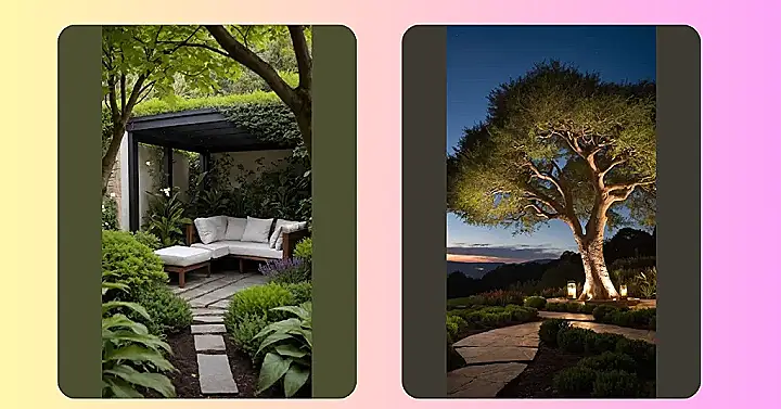 You can definitely ditch the regular backyard swing, because this garden nook is about to become your new favorite spot! Just check out that giant tree, all lit up from below like it’s ready to share the secrets of the universe – or at least, give off some super chill vibes. With those cool lights making its leaves glow like a natural, leafy disco ball, it’s practically waving you over to come hang out. The winding stone path through the neat little bushes looks like it’s leading straight to the best hidden chill zone in town.
