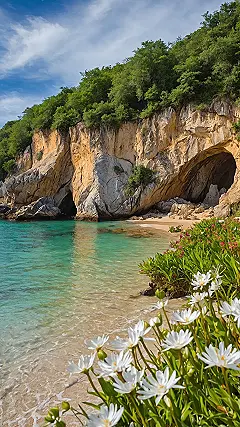 And those caves? Forget creepy haunted houses, these are natural adventure zones! You can paddle your way in, pretending you’re discovering a new world, or just chill on the sand and soak up the view while trying to get a perfectly lit selfie with those cute little white flowers. This spot screams “epic photo op” and “seriously jealous friends back home” because it’s the perfect mix of chill beach vibes and “let’s go explore that cool dark spot” mystery. Just maybe bring a flashlight, you know, just in case you find that pizza tunnel.