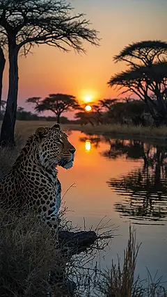 Looking at this pic, you gotta wonder what this leopard is thinking as it chills by the water. Is it pondering the meaning of life, or just waiting for snack time? Either way, this photo is peak beautiful Africa photography! The way the sunset paints the sky in fiery colours and reflects perfectly in the water, with those cool acacia trees silhouetted… and then boom, a majestic leopard just hanging out. It seriously makes you feel like you’re right there, witnessing a truly special moment in the wild heart of Africa, all thanks to someone with a camera capturing the magic.