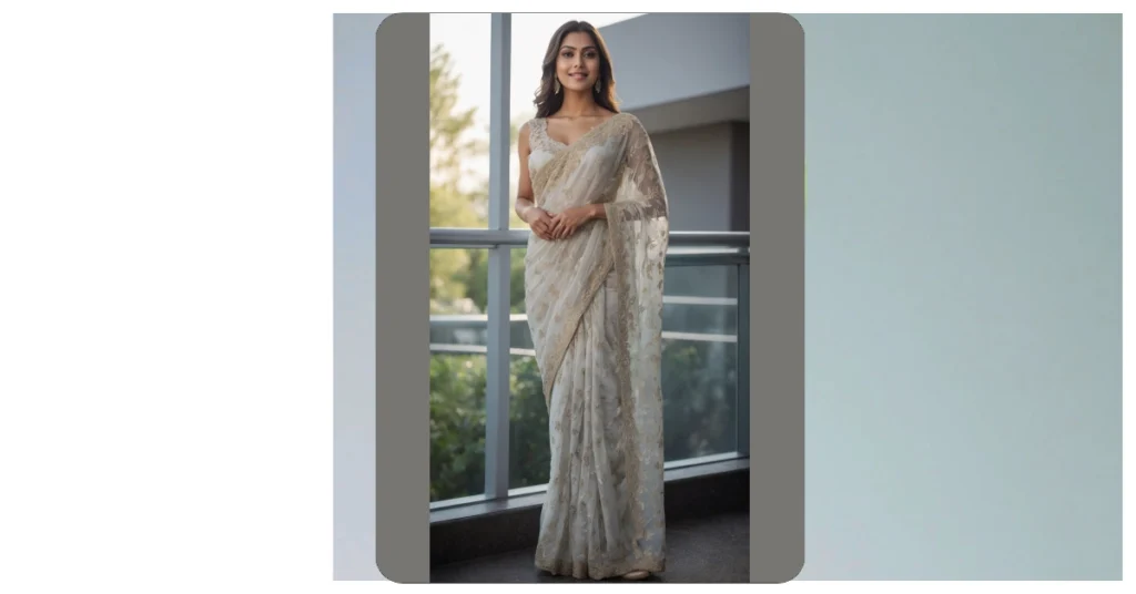 You know those moments when someone walks into the room and just oozes confidence? This fantastic lady in her elegant white and gold saree totally owns that vibe! It’s the kind of outfit that makes you feel like you could ace your history presentation and then casually win a fashion show all in the same day. With all that delicate golden embroidery catching the light, she’s practically a walking masterpiece, proving that sometimes, looking effortlessly chic actually takes a tiny bit of effort (but it’s totally worth it!).