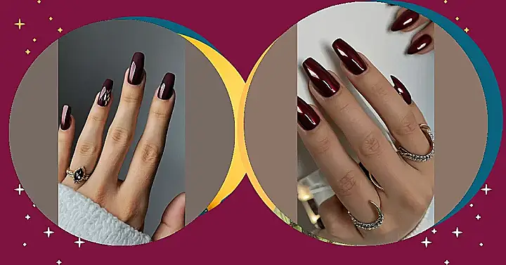 These nails are absolutely *killer*! They’re long and pointy, just like a witch’s claws. The deep, dark red color is perfect for autumn, and the shiny finish makes them look like they’re dripping with magic. Maybe they’re even cursed to turn heads everywhere you go! But seriously, how cool are they? They’re totally making me want to ditch my regular nail polish and get some dark fall nails of my own!