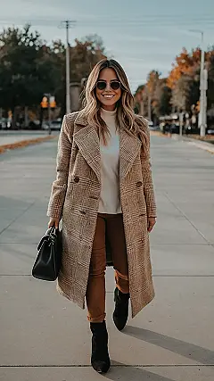 This outfit is the definition of “fall vibes,” with a stylish long coat and comfy jeans. It’s like the perfect blend of being ready for the crisp autumn air, but still feeling totally cool and put-together. The brown hues and the cute ankle boots just scream “fall fashion,” and you can totally imagine this outfit paired with a pumpkin spice latte (or maybe a hot chocolate – no judgment!).