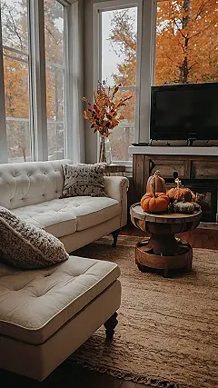The image shows a living room bursting with the warm hues of fall. It’s a perfect example of how to bring the season’s colors and textures indoors. Think comfy blankets, soft pillows, and of course, pumpkins galore! This setup is practically begging you to curl up on that cozy couch, sip some hot apple cider, and get lost in a good book. It’s like a hug from your favorite sweater, but with a pumpkin-spiced twist!