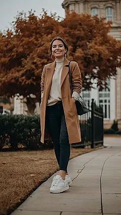 This outfit is like a warm hug on a chilly fall day! It’s all about comfort and style, and the girl in the picture looks super comfy and ready for anything. The brown coat is the perfect choice for keeping warm, and the white sweater and black jeans are a classic combination that always looks good. The white sneakers add a touch of casualness, which is perfect for a day of running errands or hanging out with friends.