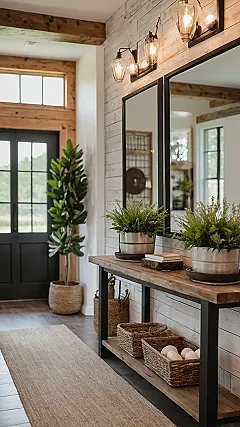 See that cool console table with the mirrors? It’s not just sitting there looking pretty; it’s practically a command center for your life! Imagine getting ready here, checking your hair in those sleek mirrors under the warm glow of those super cool candle-like lights. And those woven baskets underneath? They’re perfect for hiding all the random stuff you “organize” five minutes before guests arrive (don’t worry, we all do it). With all the fresh greenery and stylish details, this spot screams “modern farmhouse,” proving you can be both rustic and totally put-together without even trying *that* hard.