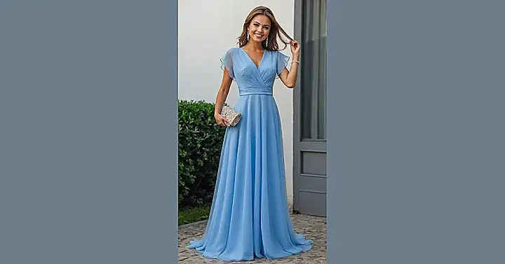 Getting ready for a wedding can sometimes feel like a mission to find something that says ‘I’m here to celebrate!’ without yelling ‘I’m trying to steal the spotlight!’ This super dreamy blue outfit nails that balance perfectly. With its flowy design and delicate flutter sleeves, you’ll feel like you’re floating, which is pretty handy when you’re trying to navigate through a crowded reception. It’s chic enough for all those fancy photos but comfy enough to bust out your best moves on the dance floor later – no awkward outfit adjustments needed!