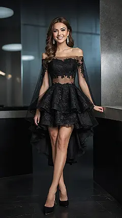 Arriving at a wedding like you’re ready for your own photoshoot is an absolute mood, and this dress totally nails it! With its super chic off-the-shoulder look and all that gorgeous lace, you’ll be making an entrance that screams “I know what’s up with the latest wedding guest outfits.” Seriously, this black beauty, with its cool tiered skirt, is basically a superpower that makes you look effortlessly put-together while still leaving everyone wondering if you secretly hired a stylist. You’ll be smiling just like our model, ready for all the compliments (and maybe an extra piece of cake!).