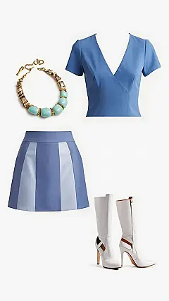 This outfit is like stepping right out of a time machine, straight into the swinging sixties! The blue mini skirt and matching top are totally mod, and the chunky necklace with its big, bold beads is the perfect way to add some retro flair. You can almost hear the music from the radio playing in the background, like a classic Beatles song!